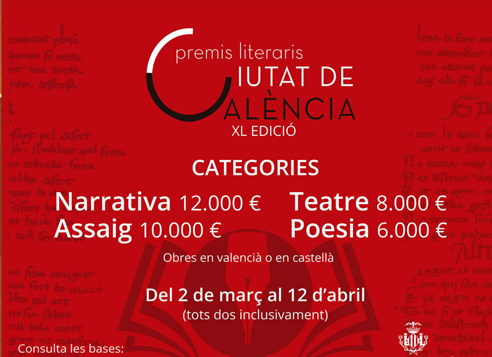 L’Ajuntament de València, a través de la Regidoria de Patrimoni i Recursos Culturals, ha convocat la 40a edició dels Premis Literaris “Ciutat de València”, corresponent a l’any 2022.