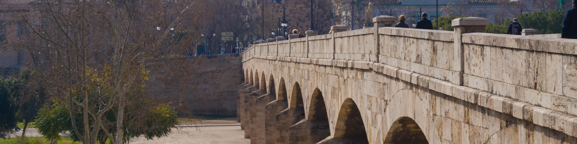 Sus orígenes como pasarela de madera datan de 1383. Después de sufrir las consecuencias de varias riadas, se reconstruyó en piedra en los primeros años del S. XVII. Fue entonces cuando se le dio su aspecto barroco y se incorporaron nuevos materiales, sillería y trece arcos escarzanos.